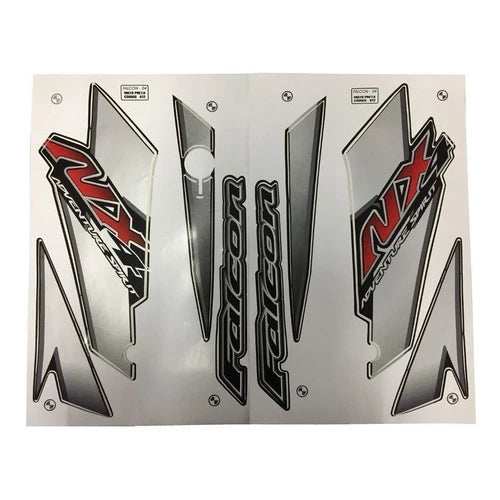 Restaure sua Honda NX 400 2004 com este kit completo de adesivos originais na clássica cor preta. Produto de primeira linha com padrão de fábrica para garantir o acabamento autêntico e elegante.