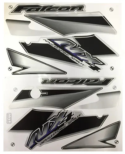 Restaure sua Honda NX 400 2005 com este kit completo de adesivos originais na clássica cor preta. Produto de primeira linha com padrão de fábrica para garantir o acabamento autêntico e elegante.
